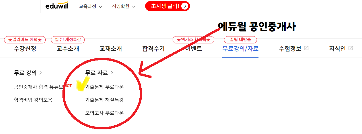 - 에듀윌 공인중개사 사이트 접속-> 무료 강의/자료 클릭-> 기출문제 무료 다운 클릭