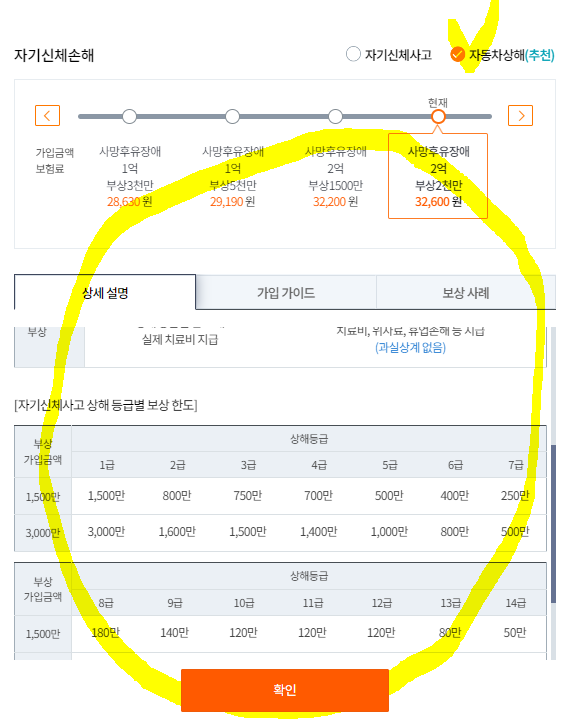 - 자기 신체 사고는 다친 정도를 등급별로 나눠서, 정해진 한도 내에서 치료비에 해당하는 내역을 보장 받으실 수 있습니다. 이 특약은 최대로 가입해도 보험비가 높지는 않습니다.