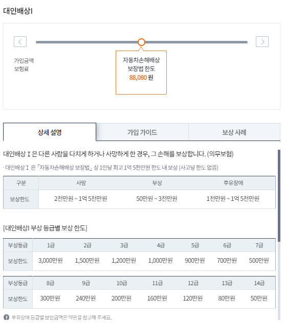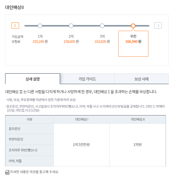 - 그렇기 때문에 대인배상에 대해서 추가로 가입을 하셔야 하는 것입니다. 저 같은 경우에는 대인배상II 또한 무한으로 금액을 크게 설정하는 편입니다. 비용이 아깝다고 생각하시면 안됩니다. 제 의견은 그렇습니다.