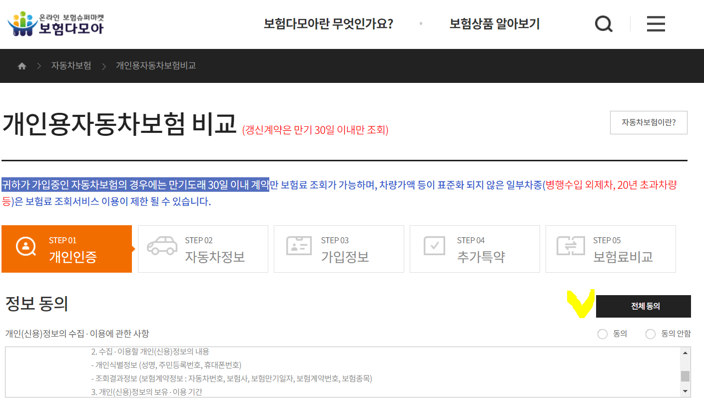- 이후 자동차 보험 비교 클릭> 개인인증 진행 해 주시면 됩니다.