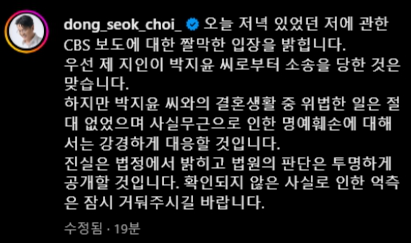 박지윤씨가 여성A씨 상대로 소송을 진행하자, 최동석은 "사실 무근"이라는 입장을 내 놓은바가 있다. "제 지인이 박지윤씨로부터 소송을 당한 것은 맞다"라는 말은 전하며, " 박지윤씨와 결혼생활 중, 위법한 일은 절대 없었고, 사실무근으로 인한 명예 훼손에 대해 강경하게 대응할 것" 이라는 뜻을 전한바가 있다.